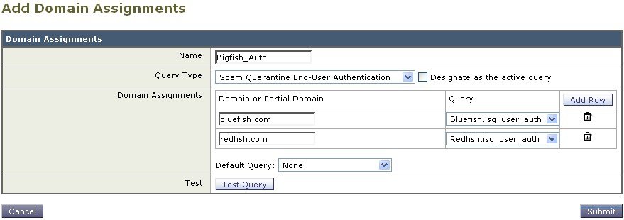 The domain-based query becomes the active LDAP query for the specified query type. For example, if the domain-based query is used for end-user authentication, it becomes the active end-user authentication query for the spam quarantine.